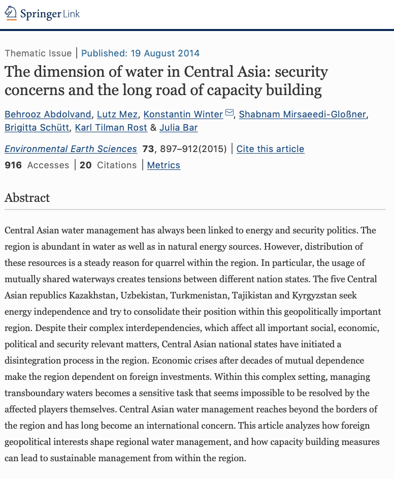 Central Asian water management has always been linked to energy and security politics. The region is abundant in water as well as in natural energy sources. However, distribution of these resources is a steady reason for quarrel within the region. In particular, the usage of mutually shared waterways creates tensions between different nation states. The five Central Asian republics Kazakhstan, Uzbekistan, Turkmenistan, Tajikistan and Kyrgyzstan seek energy independence and try to consolidate their position within this geopolitically important region. Despite their complex interdependencies, which affect all important social, economic, political and security relevant matters, Central Asian national states have initiated a disintegration process in the region. Economic crises after decades of mutual dependence make the region dependent on foreign investments. Within this complex setting, managing transboundary waters becomes a sensitive task that seems impossible to be resolved by the affected players themselves. Central Asian water management reaches beyond the borders of the region and has long become an international concern. This article analyzes how foreign geopolitical interests shape regional water management, and how capacity building measures can lead to sustainable management from within the region.