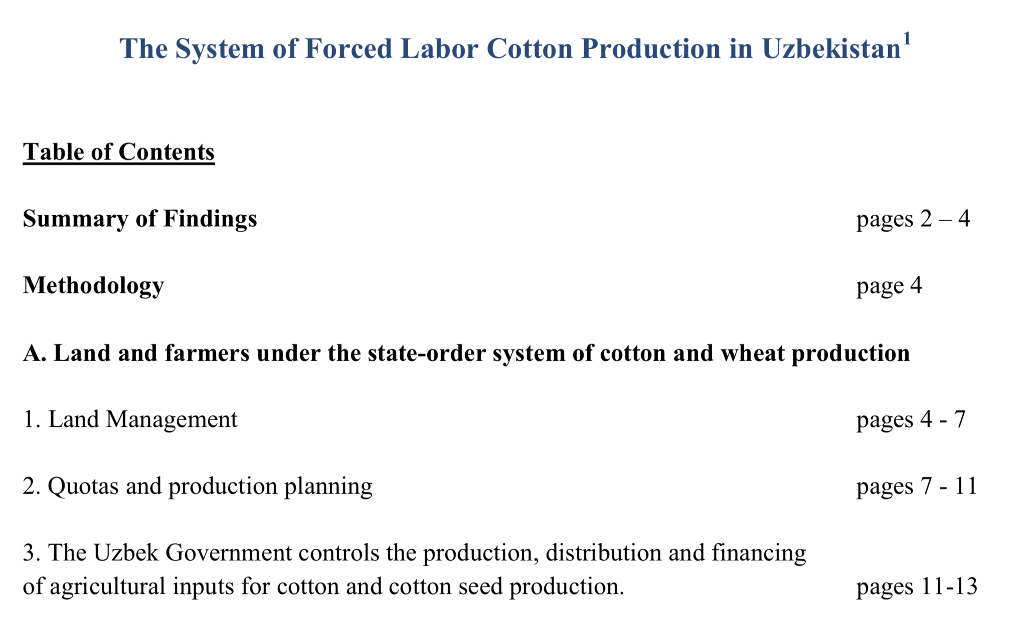 With a series of legal reforms beginning in 1991 and continuing until today, the Government of Uzbekistan (GoU) has consolidated total control over agriculture production in Uzbekistan through a process of replacing government owned and managed “collective farms” with so- called “private farms” leased to farmers. In doing so, the current Government of Uzbekistan has built a centrally-controlled political and economic patronage system to control and benefit from the production of cotton. The paper reveals the production of cotton in Uzbekistan, demonstrates the involvement of stakeholders, volumes of the harvest, as well as political, social and economic aspects of the cotton agriindustry.