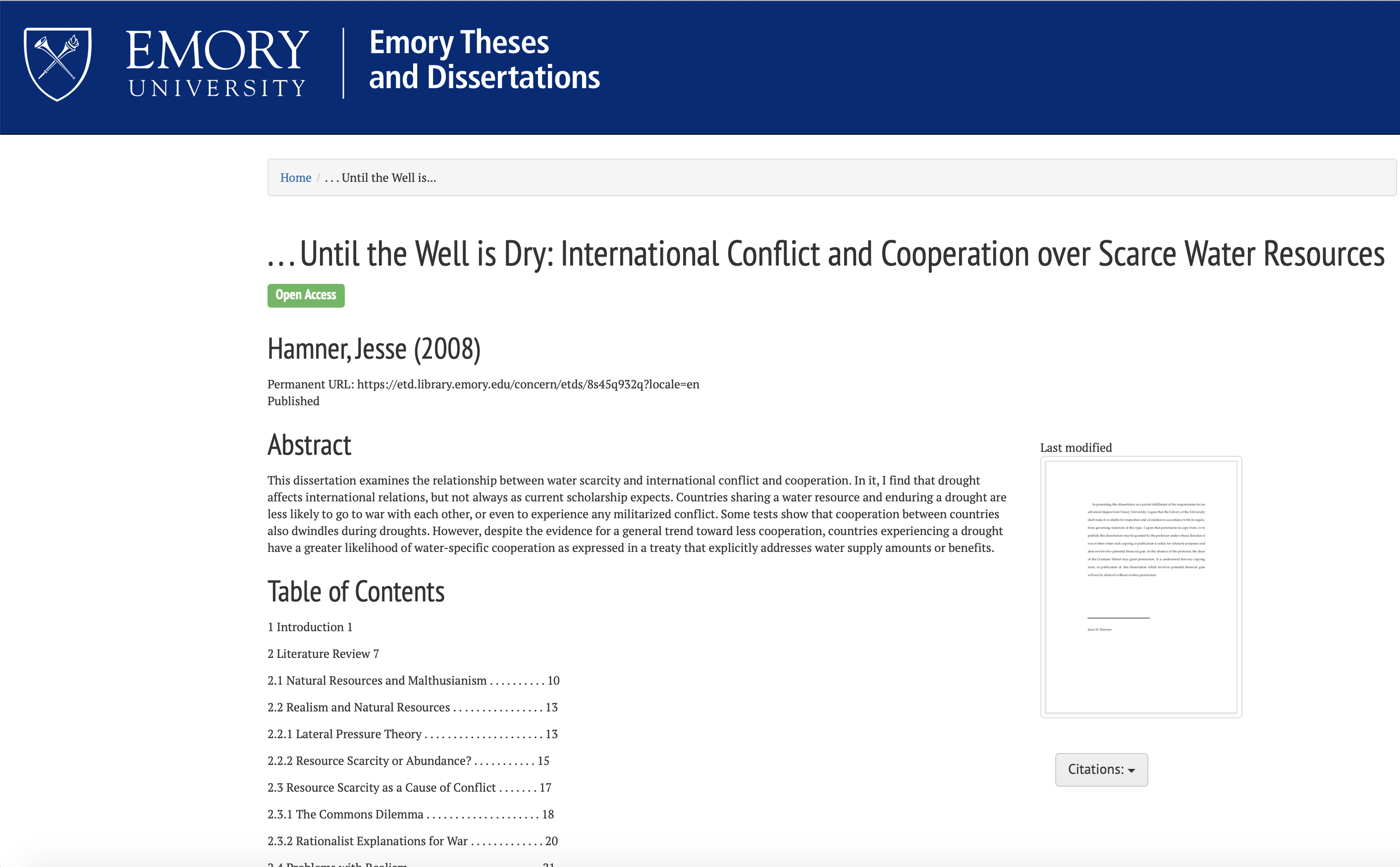 This dissertation examines the relationship between water scarcity and international conflict and cooperation. In it, I find that drought affects international relations, but not always as current scholarship expects. Countries sharing a water resource and enduring a drought are less likely to go to war with each other, or even to experience any militarized conflict. Some tests show that cooperation between countries also dwindles during droughts. However, despite the evidence for a general trend toward less cooperation, countries experiencing a drought have a greater likelihood of water-specific cooperation as expressed in a treaty that explicitly addresses water supply amounts or benefits.